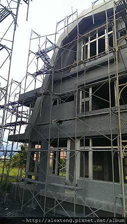 那就是外牆工程的第一階段 — 洗石子工程, 終於開始.