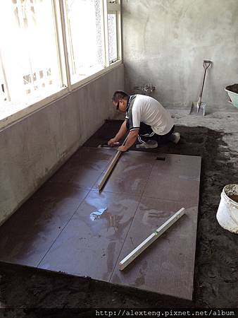 上圖: 師傅謹慎小心地進行地磚鋪設, 只見他們求好心切,