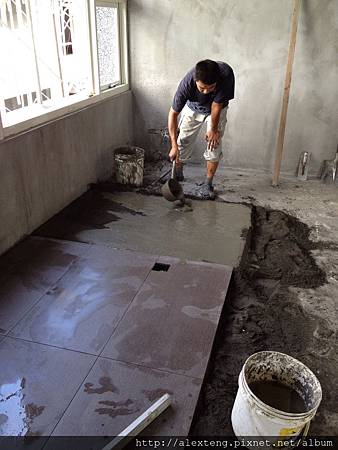 上圖: 陽台的室外地磚, 由最前緣泥作突出高度看得出其洩水坡度作得不緩